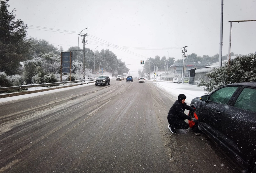 Στον Άγιο Στέφανο, τα περιπολικα σταματούν τους οδηγούς αυτοκινήτων για να βάλουν αλυσίδες ώστε να βγουν στην Αθηνών-Λαμίας.