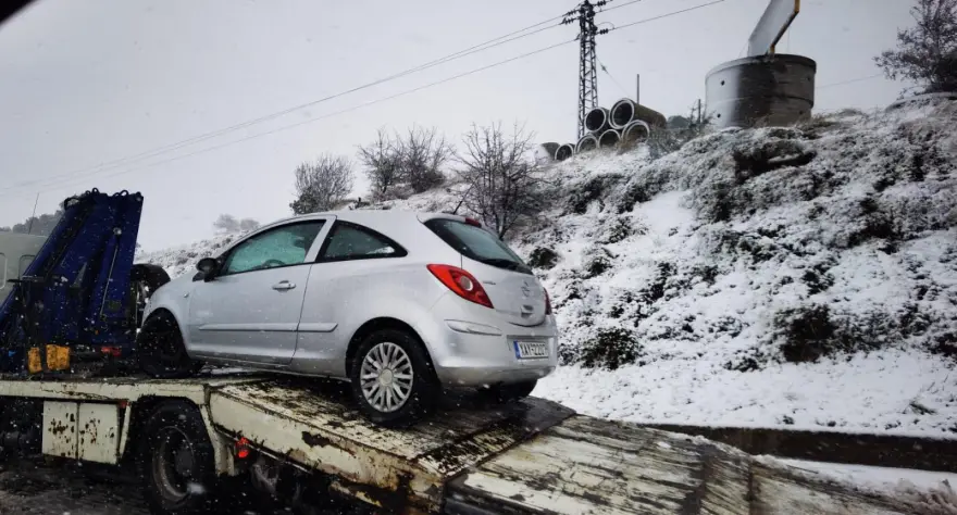 Σε παράδρομο στο Καπανδρίτι, όχημα χωρίς αλυσίδες έμεινε και το πήρε γερανός.