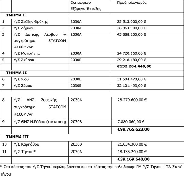 Πρόκειται ειδικότερα για την Α’ Φάση «στο πλαίσιο διαδικασίας με διαπραγμάτευση με προηγούμενη προκήρυξη διαγωνισμού για την ανάδειξη έως τριών αναδόχων και σύναψη Συμφωνίας-Πλαίσιο για το έργο: «Μελέτη, Προμήθεια Εξοπλισμού και Εγκατάσταση («έργο με το κλειδί στο χέρι») έντεκα έργων Υ/Σ 150kV και δύο συγκροτημάτων STATCOM για τη διασύνδεση του ΒΑ Αιγαίου, Δωδεκανήσων και Κυκλάδων με το ΕΣΜΗΕ».