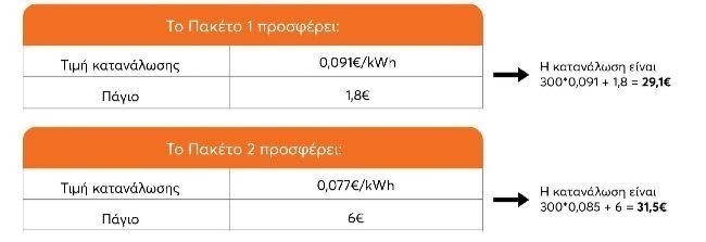 Για παράδειγμα, έστω ότι συγκρίνουμε δύο πακέτα δύο διαφορετικών προμηθευτών για ένα νοικοκυριό μηνιαίας κατανάλωσης 300 kwh.