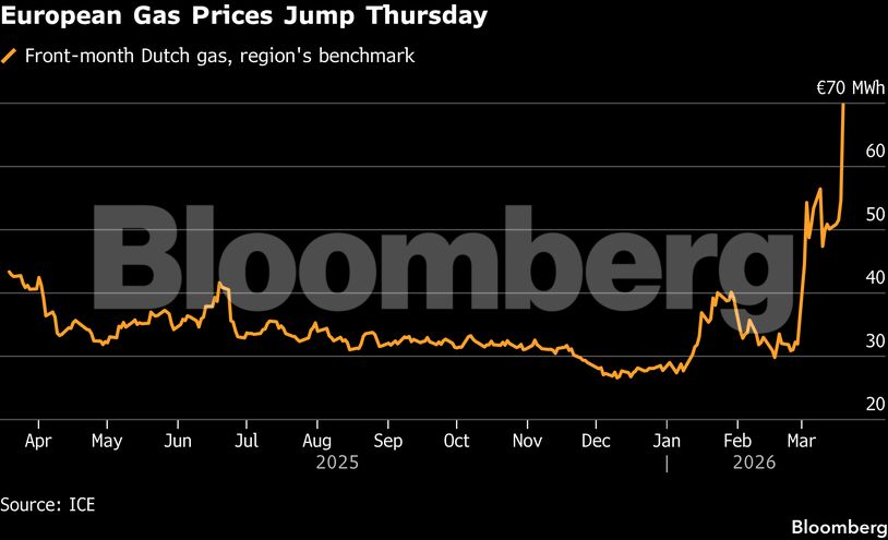 Οι τιμές του φυσικού αερίου στην Ευρώπη εκτοξεύτηκαν κατά 35% μετά την εντατικοποίηση των επιθέσεων από το Ιράν στις ενεργειακές υποδομές στον Κόλπο, προκαλώντας ζημιές στο μεγαλύτερο εργοστάσιο εξαγωγής υγροποιημένου φυσικού αερίου στον κόσμο.