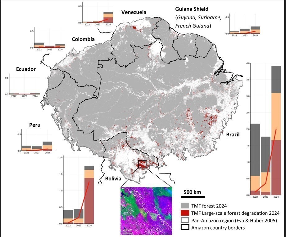 Σύμφωνα με τη μελέτη ερευνητών του Κοινού Κέντρου Ερευνών της Ευρωπαϊκής Επιτροπής που δημοσιεύθηκε στο περιοδικό «Biogeosciences», 3,3 εκατομμύρια εκτάρια δάσους στον Αμαζόνιο επηρεάστηκαν από πυρκαγιές μόνο κατά το περασμένο έτος. Αυτή η αύξηση φαίνεται να οφείλεται σε έναν συνδυασμό ακραίας ξηρασίας που επιδεινώνεται από την κλιματική αλλαγή, κατακερματισμού του δάσους και κακής διαχείρισης γης (π.χ. ανεξέλεγκτες φωτιές ή εμπρησμοί από καταπατητές), οδηγώντας σε σημαντική υποβάθμιση του δάσους. Στην ανάλυση που καλύπτει την περίοδο 2022-2024, η υποβάθμιση λόγω πυρκαγιών ξεπέρασε για πρώτη φορά την αποψίλωση ως κύρια αιτία εκπομπών διοξειδίου του άνθρακα στον Αμαζόνιο. Υπολογίζεται ότι η αύξηση των εκπομπών είναι επταπλάσια σε σχέση με τον μέσο όρο των δύο προηγούμενων ετών.