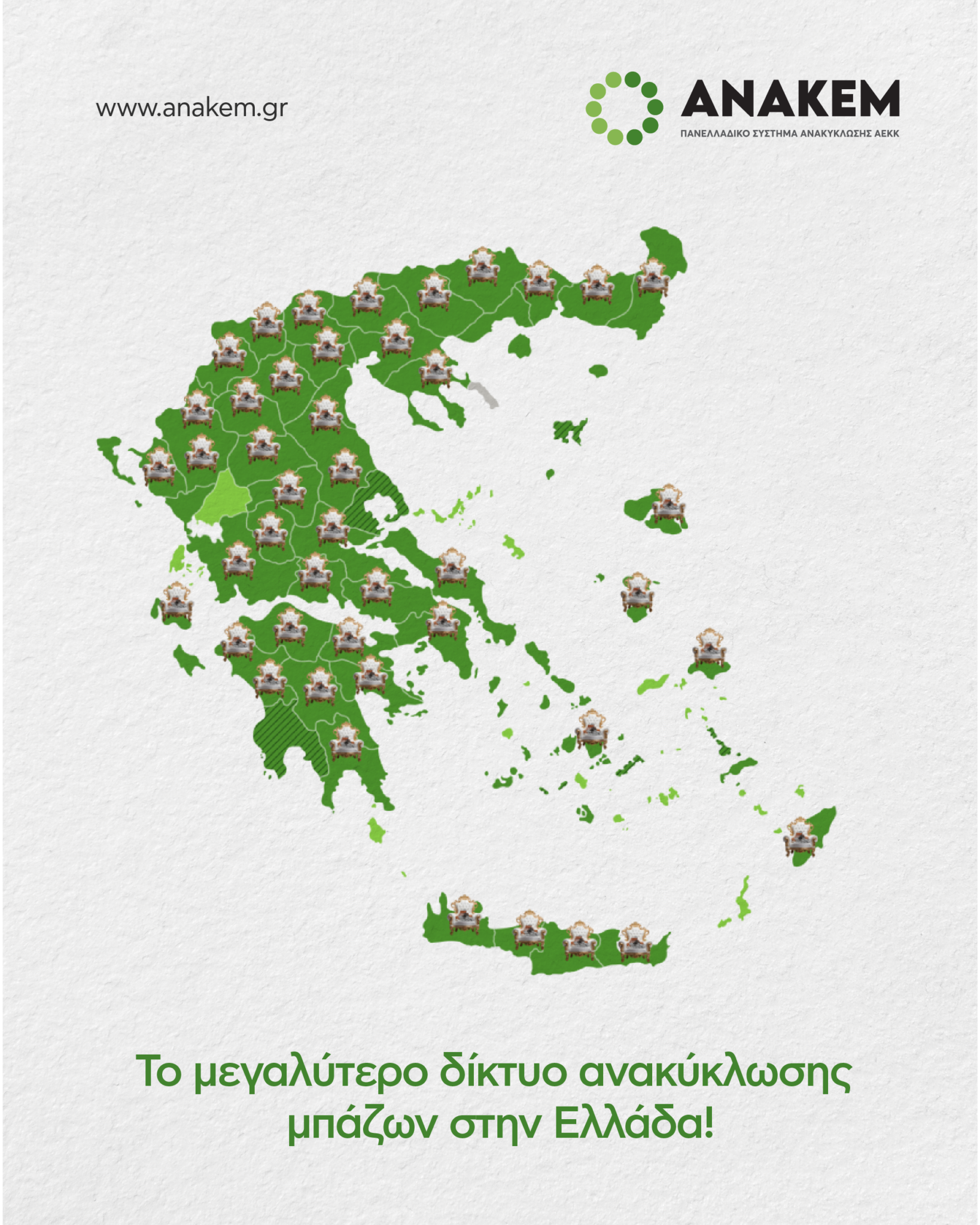 Με απόφαση του Ελληνικού Οργανισμού Ανακύκλωσης (ΕΟΑΝ), η ΑΝΑΚΕΜ Α.Ε. διευρύνει περαιτέρω τη δραστηριότητά της σε επτά Περιφερειακές Ενότητες και συγκεκριμένα των Τρικάλων, της Καρδίτσας, της Φθιώτιδας, της Κορινθίας, της Αρκαδίας, της Σάμου και στο νησί της Αντιπάρου.