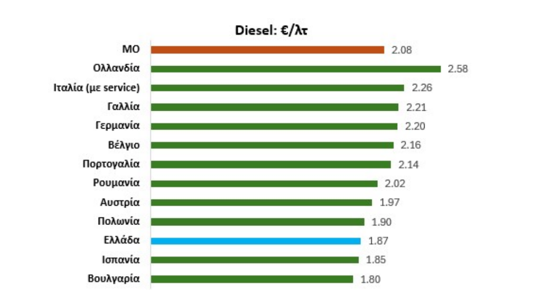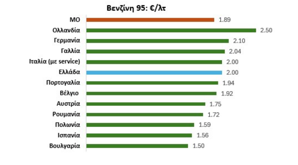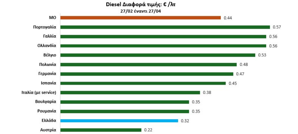 Από τη σύγκριση των τιμών πρατηρίων για αμόλυβδη 95 και ντίζελ προκύπτει ότι η Ελλάδα καταγράφει από τις χαμηλότερες αυξήσεις μεταξύ των χωρών της Ευρωζώνης. Ιδιαίτερα στο ντίζελ, η χώρα μας παρουσιάζει τη δεύτερη χαμηλότερη αύξηση τιμών, ενώ στην αμόλυβδη κινείται κοντά στον μέσο όρο της Ευρωζώνης.