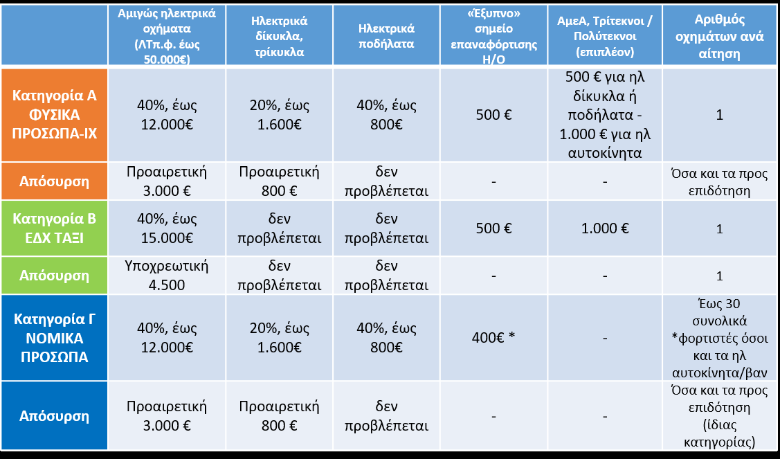 Σε ότι αφορά τα ταξί, η αγορά θα ενισχύεται με 40% έως 15.000 ευρώ, με την απόσυρση του παλαιού οχήματος να είναι υποχρεωτική. Για τα νομικά πρόσωπα προσφέρεται επίσης επιδότηση για ΙΧ έως 12.000, έως 1.600 για δίκυκλα, 800 ευρώ για ηλεκτρικά ποδήλατα και 400 για σημεία φόρτισης.