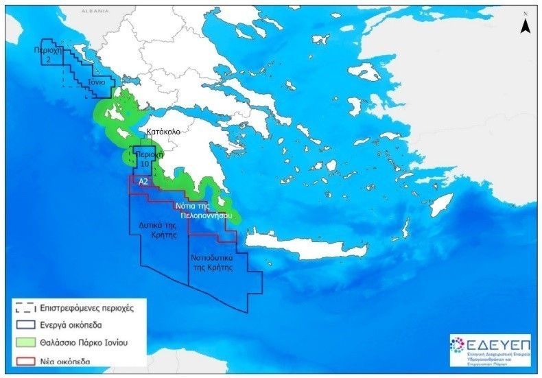 Πρώτον, απελευθερώνονται ήδη αδειοδοτημένες θαλάσσιες περιοχές έρευνας υδρογονανθράκων στο Ιόνιο Πέλαγος, οι οποίες θα διευρύνουν χωρικά και θα καταστήσουν συνεχές το Εθνικό Θαλάσσιο Πάρκο του Ιονίου, για την επίτευξη των περιβαλλοντικών στόχων του.