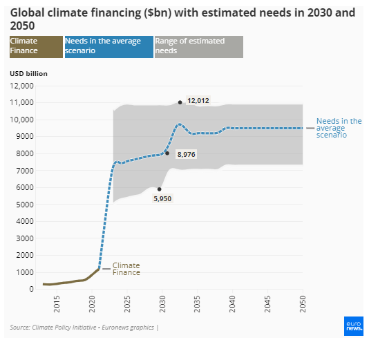 Ορισμένες ομάδες εμπειρογνωμόνων λένε ότι το ποσό της απαιτούμενης χρηματοδότησης για το κλίμα αναμένεται να ανέλθει σε 9 τρισ. δολάρια (8,5 τρισ. ευρώ) έως το 2030.