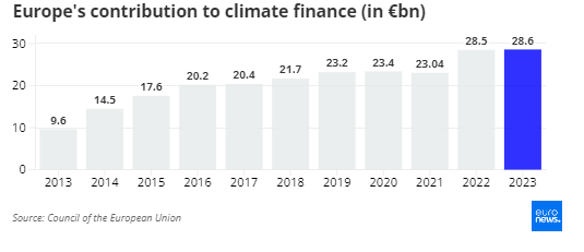 Το 2023, η Ευρωπαϊκή Ένωση και τα 27 κράτη μέλη της συνεισέφεραν 28,6 δισεκατομμύρια ευρώ από δημόσιες πηγές και κινητοποίησαν επιπλέον 7,2 δισεκατομμύρια ευρώ σε ιδιωτική χρηματοδότηση για να στηρίξουν τις αναπτυσσόμενες χώρες στην καταπολέμηση της κλιματικής αλλαγής.