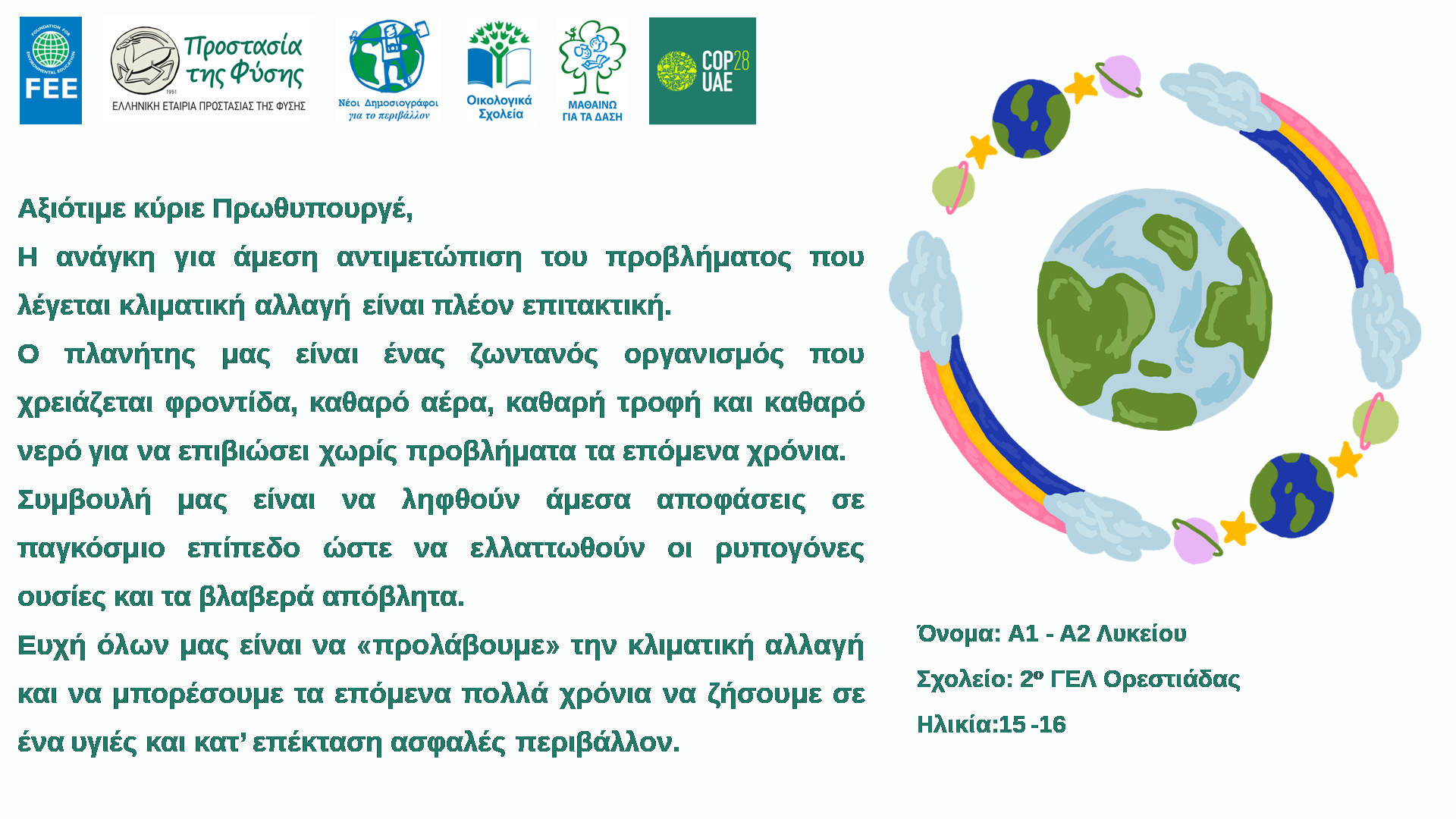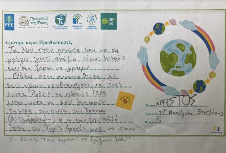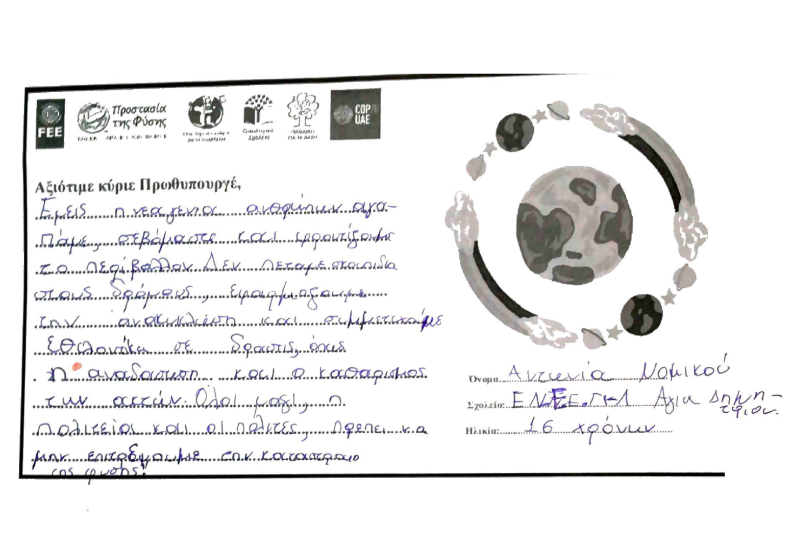 Εν όψει αυτής της πολύ σημαντικής παγκόσμιας συνάντησης, η ΕΕΠΦ κάλεσε όλο το μαθητικό κοινό που συμμετέχει στα εκπαιδευτικά της Δίκτυα να μεταφέρει, με τον δικό του πρωτότυπο λόγο, τις ανάγκες, τις εκκλήσεις, αλλά και το αισιόδοξο μήνυμά του για το περιβάλλον, την κλιματική αλλαγή και την προστασία της φύσης, στον Πρωθυπουργό της Ελλάδας, ο οποίος θα συμμετέχει στην COP28.
