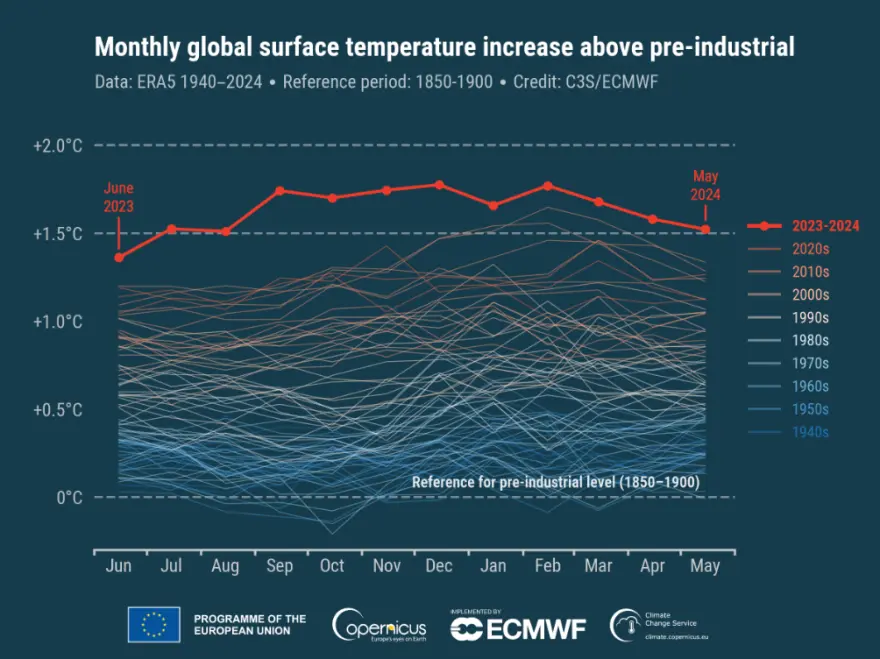 Η παγκόσμια μέση θερμοκρασία για τον Μάιο του 2024 ήταν 0,65°C πάνω από τον μέσο όρο της περιόδου 1991-2020 και 1,52°C πάνω από τον προβιομηχανικό μέσο όρο του 1850-1900, σηματοδοτώντας τον 11ο συνεχόμενο μήνα (από τον Ιούλιο του 2023) για τον οποίο η παγκόσμια μέση θερμοκρασία έφτασε ή ξεπέρασε τον 1,5°C πάνω από τα προβιομηχανικά επίπεδα.