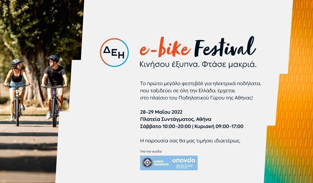 Το πρώτο, μεγάλο φεστιβάλ για ηλεκτρικά ποδήλατα στην Ελλάδα, το ΔΕΗ e-bike Festival, θα βρίσκεται το Σαββατοκύριακο 28 – 29 Μάϊου 2022, στην πλατεία Συντάγματος, στο πλαίσιο του Ποδηλατικού Γύρου της Αθήνας που διοργανώνει ο Δήμος Αθηναίων μέσω του Οργανισμού Πολιτισμού, Αθλητισμού & Νεολαίας (ΟΠΑΝΔΑ), με μεγάλο χορηγό τη ΔΕΗ.