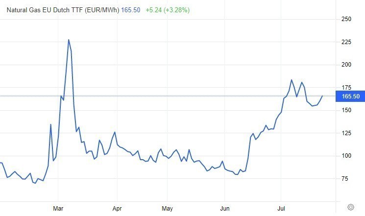 Είναι ενδεικτικό ότι στο Χρηματιστήριο Ενέργειας του Άμστερνταμ τα συμβόλαια TTF αυξάνονται κατά περίπου 4% και διαμορφώνονται άνω των 165 ευρώ ανά μεγαβατώρα, ενόσω συνεχίζεται το μπρα-ντε-φερ Ευρώπης και Ρωσίας για τις παραδόσεις αερίου.