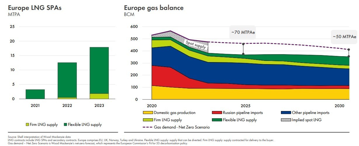 Κατά την Shell, η ευρωπαϊκή αγορά θα χρειαστεί περίπου 70 εκατ. τόνους ετησίως μέχρι το 2025 και 50 εκατ. τόνους μέχρι το 2030, κάτι που σημαίνει ότι τα συμβόλαια LNG που έχουν «κλειστεί» μέχρι τώρα δεν επαρκούν. Γεγονός που θα αυξήσει τον ανταγωνισμό της Ευρώπης με την Ασία για νέες προμήθειες.