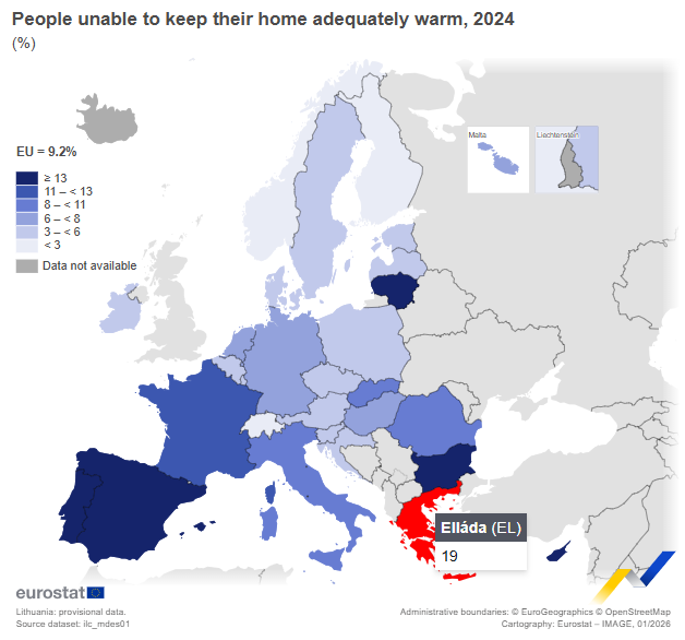 Ωστόσο, οι αποκλίσεις μεταξύ των κρατών-μελών παραμένουν έντονες σύμφωνα με την Eurostat. Τα υψηλότερα ποσοστά καταγράφηκαν στη Βουλγαρία και την Ελλάδα, όπου το 19% του πληθυσμού αδυνατεί να διατηρήσει επαρκή θέρμανση στο σπίτι του. Ακολουθούν η Λιθουανία με 18% και η Ισπανία με 17,5%.
