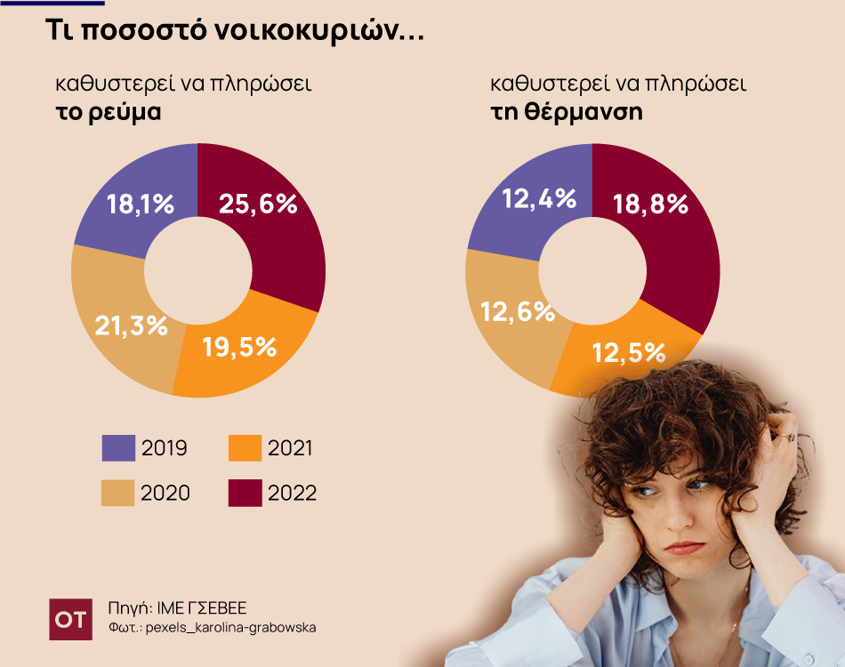 Ειδικότερα, και σύμφωνα με την έρευνα του ΙΜΕ της ΓΣΕΒΕΕ που έγινε για το 2022 ένα στα τέσσερα νοικοκυριά (25,6%) καθυστερεί να πληρώσει το ηλεκτρικό ρεύμα και το 18,8% του λογαριασμούς θέρμανσης. Στους τελευταίους περιλαμβάνεται κατά κύριο λόγο η κατανάλωση φυσικού αερίου. Ο αριθμός των οικογενειών που έχουν φτάσει σε αυτό το αδιέξοδο έχει αυξηθεί έναντι του 2021. Τότε η έρευνα έδειχνε πως το ποσοστό που δήλωνε ότι δεν πληρώνει εγκαίρως τους λογαριασμούς ρεύματος ήταν στο 19,5% και τους αντίστοιχους της θέρμανσης ήταν στο 12,5%.