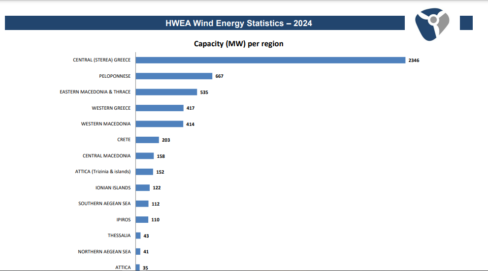 Σε επίπεδο Περιφερειών, η Στερεά Ελλάδα παραμένει στην κορυφή των αιολικών εγκαταστάσεων αφού φιλοξενεί 2.346 MW (44%) και ακολουθεί η Πελοπόννησος με 667 ΜW (12%) και η Ανατολική Μακεδονία – Θράκη όπου βρίσκονται 535 MW (10%).