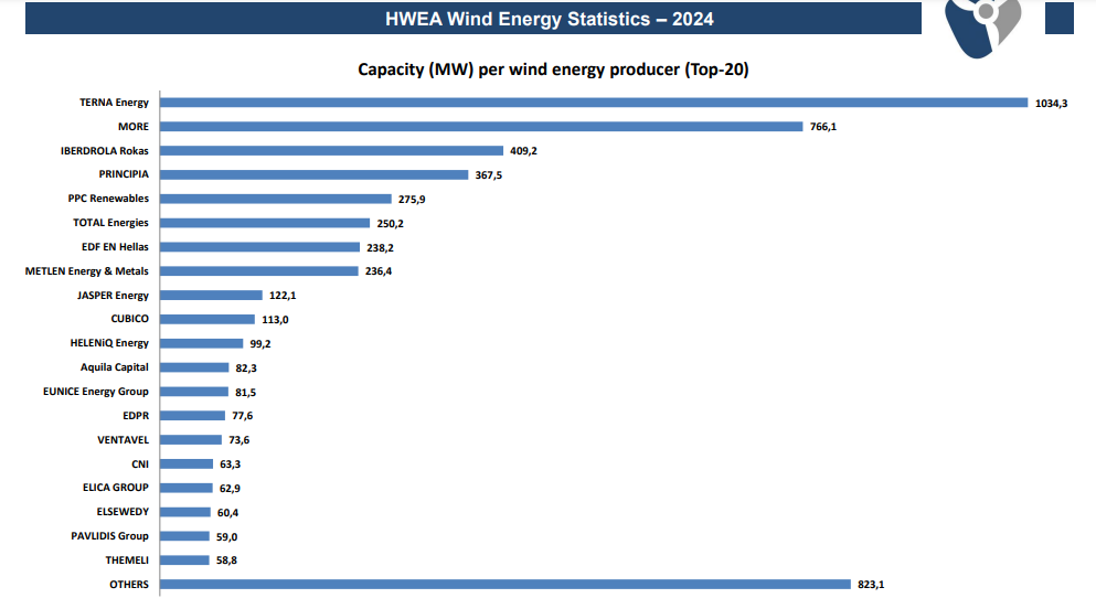 To 2024 τις νέες ανεμογεννήτριες προμήθευσαν: η Enercon (44,1ΜW – 35,1%), η Vestas (39,6MW – 31,6%), η Siemens Gamesa (39,2MW – 31,2%) και η Goldwind (2,6MW – 2,1%).