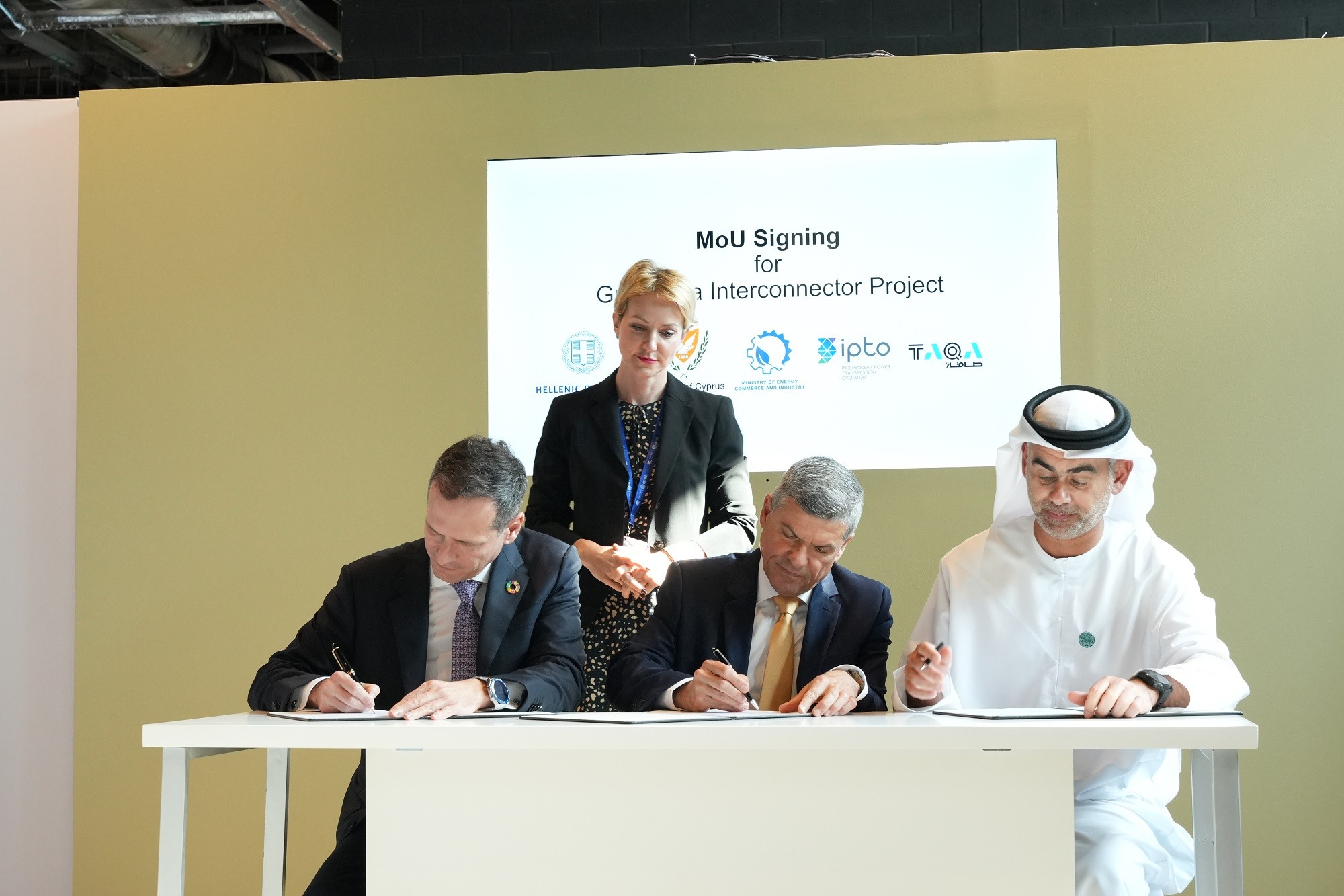 Μνημόνιο Κατανόησης (MoU) μεταξύ του Ανεξάρτητου Διαχειριστή Μεταφοράς Ενέργειας της Ελλάδας (ΑΔΜΗΕ), του Υπουργείου Ενέργειας, Εμπορίου και Βιομηχανίας της Κύπρου και της TAQA, καθετοποιημένου ενεργειακού ομίλου με έδρα το Άμπου Ντάμπι υπεγράφη χθες, Δευτέρα 4 Δεκεμβρίου, στο ελληνικό περίπτερο στην COP 28 στο Ντουμπάι.