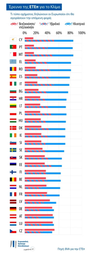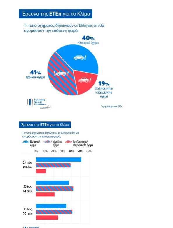 Στην ερώτηση σχετικά με μελλοντική αγορά αυτοκινήτου, το 81% των Ελλήνων δηλώνουν ότι θα αγοράσουν είτε υβριδικό είτε ηλεκτρικό αυτοκίνητο. Αυτό το ποσοστό είναι κατά 62 μονάδες υψηλότερο από το ποσοστό των Ελλήνων που δηλώνουν ότι θα αγόραζαν ντιζελοκίνητο ή βενζινοκίνητο όχημα (19%). Ειδικότερα, το 41% θα αγόραζε υβριδικό όχημα και το 40% θα επέλεγε ηλεκτρικό όχημα.
