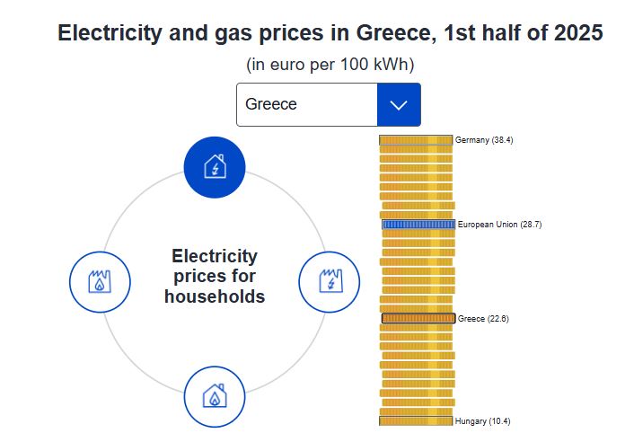 Χαμηλότερη μεν από τον μέσο όρο της ΕΕ, υψηλότερη δε από πολλές χώρες της Ενωσης διαμορφώθηκε η τιμή της ηλεκτρικής ενέργειας για τα ελληνικά νοικοκυριά κατά το πρώτο εξάμηνο του 2025, όπως προκύπτει από τα στοιχεία της Eurostat για μια εκ των πλέον βασικών δαπανών για τα νοικοκυριά και την οικονομία στην Ευρωπαϊκή Ένωση.