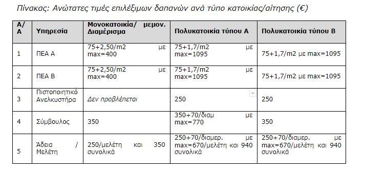 Για πολυκατοικίες τύπου Α/Β, η αμοιβή για την επιθεώρηση και την έκδοση πιστοποιητικού ελέγχου ανελκυστήρα από αναγνωρισμένο φορέα, όπως υλοποιούνται σύμφωνα με τις κείμενες διατάξεις, μέχρι ποσού των 250 €.