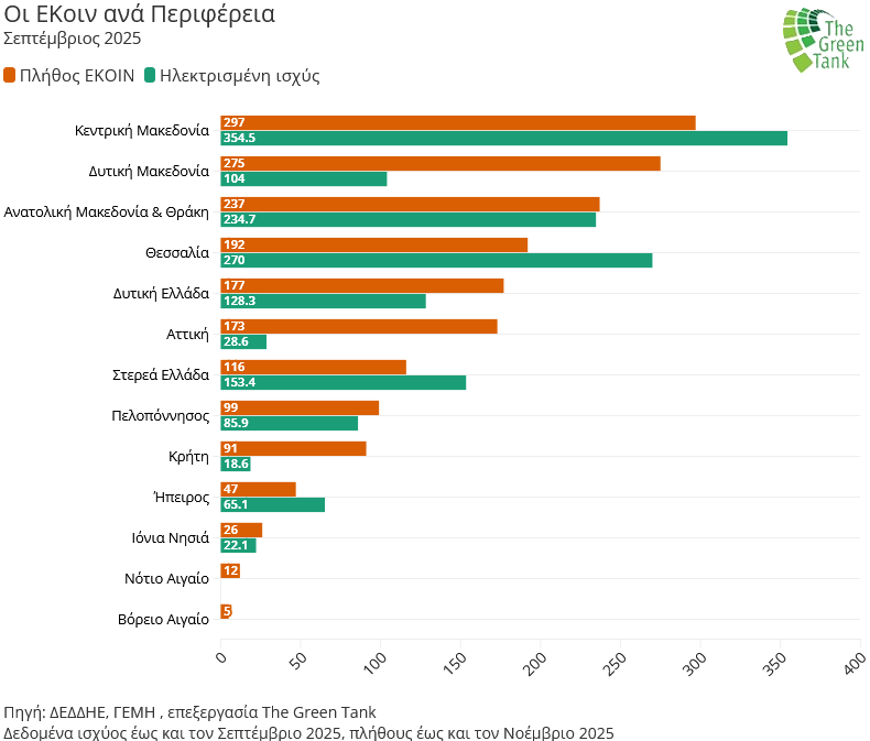 • Πρωταθλήτρια η Κεντρική Μακεδονία: Έχει τις περισσότερες ενεργειακές κοινότητες (297) και τη μεγαλύτερη ισχύ ηλεκτρισμένων (354.5 MW) αλλά και ακυρωμένων έργων (682.6 MW).