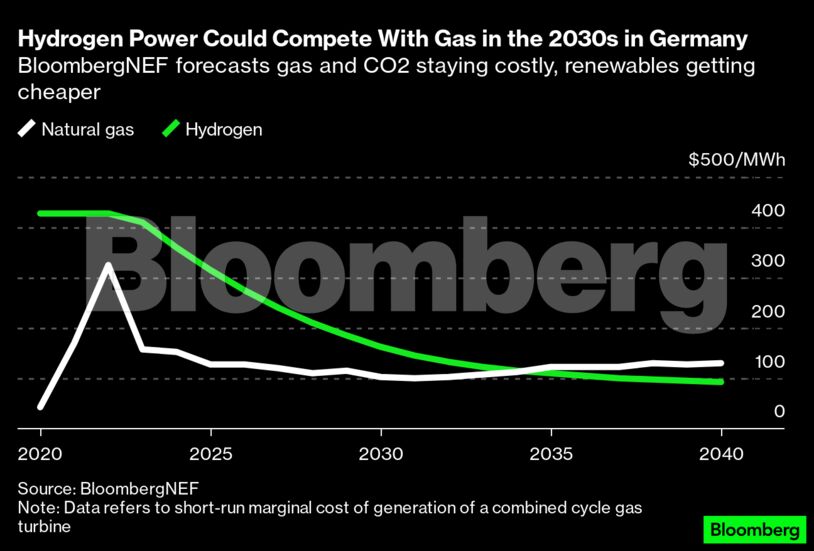 Παράλληλα, η ισχύς υδρογόνου θα μπορούσε να ανταγωνιστεί το αέριο τη δεκαετία του 2030 στη Γερμανία. Το BloombergNEF προβλέπει ότι το φυσικό αέριο και το CO2 θα παραμείνουν δαπανηρά, ενώ οι ανανεώσιμες πηγές ενέργειας φθηνότερες.