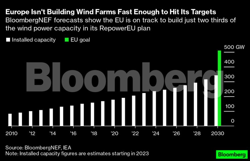 Οι προβλέψεις του BloombergNEF δείχνουν ότι η ΕΕ βρίσκεται σε καλό δρόμο να χτίσει μόνο τα δύο τρίτα της δυναμικότητας αιολικής ενέργειας που ορίζεται στο σχέδιο RepowerEU