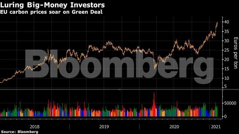 Χθες, Πέμπτη, η τιμή των αδειών εκπομπής στην ΕΕ έφτασαν στο υψηλό όλων των εποχών των 40,12 ευρώ (ανά μετρικό τόνο), εκτοξεύοντας έτσι τα κέρδη από την περασμένη χρονιά κατά 70%. Μεγάλο μέρος αυτής της έκρηξης κερδών οφείλεται σε συγκεκριμένους μεγαλο-επενδυτές που «προβλέπουν» την πορεία της αγοράς και με τις κινήσεις τους, κατά κάποιο τρόπο «χειραγωγούν» τις τιμές.