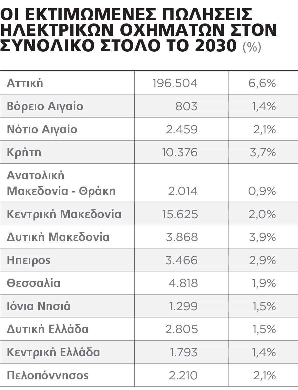 Σήμερα οι δημόσιοι σταθμοί φόρτισης εξακολουθούν να παρουσιάζουν μεγάλη αντίθεση μεταξύ των κρατών-μελών, με την Ολλανδία να ηγείται του σχεδιασμού, ακολουθούμενη από το Λουξεμβούργο, τη Σουηδία, το Βέλγιο και την Αυστρία. Η αντίθεση αυτή εξαπλώνεται και στη χώρα μας καθώς η ταξινόμηση ηλεκτρικών οχημάτων δείχνει να αναπτύσσεται με ταχύτερους ρυθμούς σε Αττική και Κεντρική Μακεδονία, ενώ σε περιοχές όπως η Ανατολική Μακεδονία, η Θράκη και το Βόρειο Αιγαίο φαίνεται να υστερεί, σύμφωνα με πρόσφατη έκθεση της Deloitte και ακαδημαϊκού φορέα που κάνει και κάποιες εκτιμήσεις για τις πωλήσεις ηλεκτρικών οχημάτων έως το 2030 με βάση ένα αισιόδοξο σενάριο (βλ. σχετικό πίνακα).