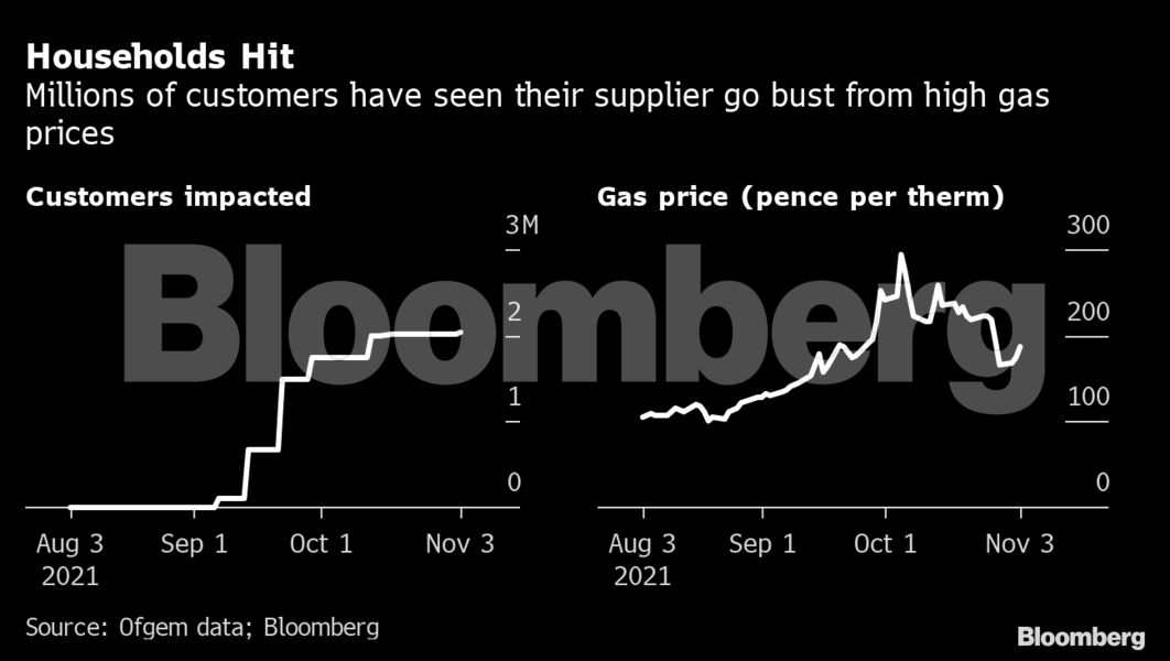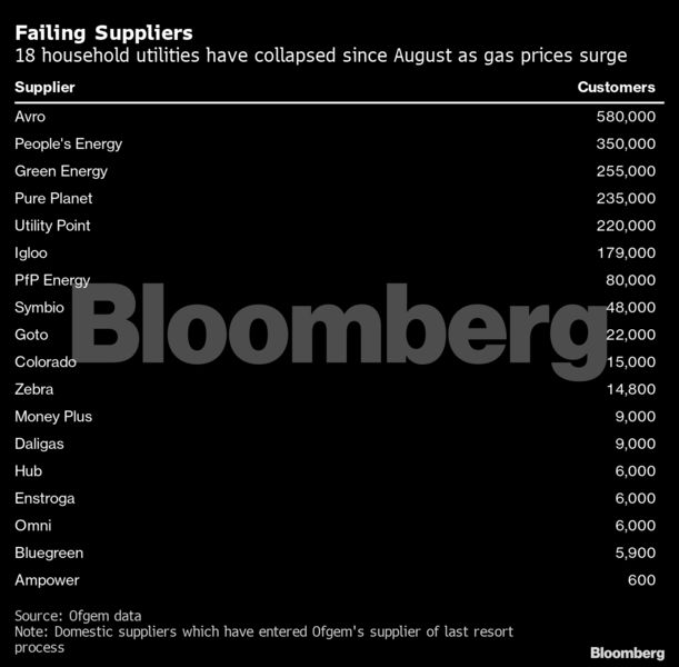 Περίπου 18 εταιρείες έχουν καταρρεύσει στο Ηνωμένο Βασίλειο από τις αρχές Αυγούστου και 25 εγχώριοι προμηθευτές παραμένουν σε μια αγορά που είχε σχεδόν διπλάσιο αριθμό στην αρχή του έτους. Αρκετές ακόμη εταιρείες φαίνεται να διατρέχουν άμεσο κίνδυνο, με ορισμένες από αυτές να χάνουν την προθεσμία για να πληρώσουν τις εισφορές ανανεώσιμων πηγών ενέργειας και άλλες να μην μπορούν να καταβάλουν την πιστωτική κάλυψη που απαιτείται από τους κανόνες της αγοράς. Η ρυθμιστική αρχή Ofgem σχεδιάζει να κάνει αλλαγές στο ανώτατο όριο τιμών, αλλά αυτές δεν θα ξεκινήσουν μέχρι τον Απρίλιο.