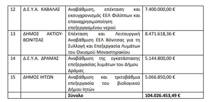 Ο συνολικός προϋπολογισμός για το υποέργο «Αναβάθμιση, επέκταση και εκσυγχρονισμός εγκαταστάσεων επεξεργασίας λυμάτων και επαναχρησιμοποίηση επεξεργασμένου νερού» φτάνει τα 104.026.453 ευρώ, με πιστώσεις που κυμαίνονται από 1,52 εκατ. ευρώ έως και 22,6 εκατ. ευρώ.