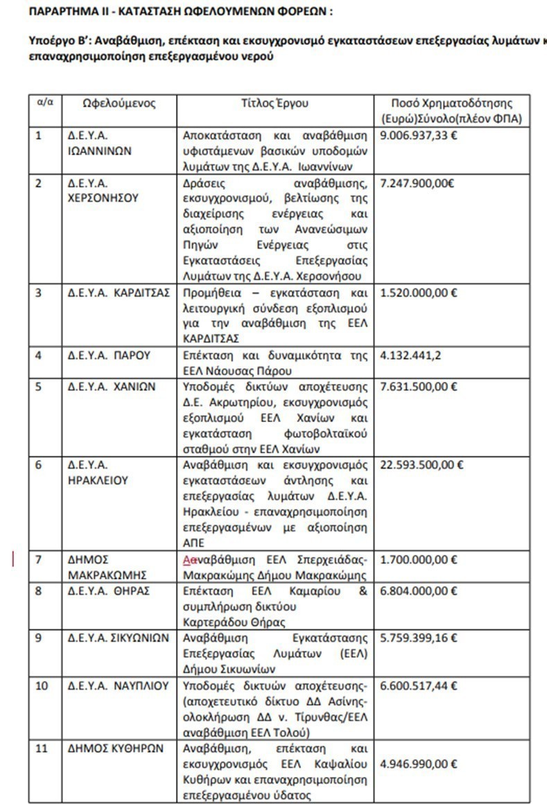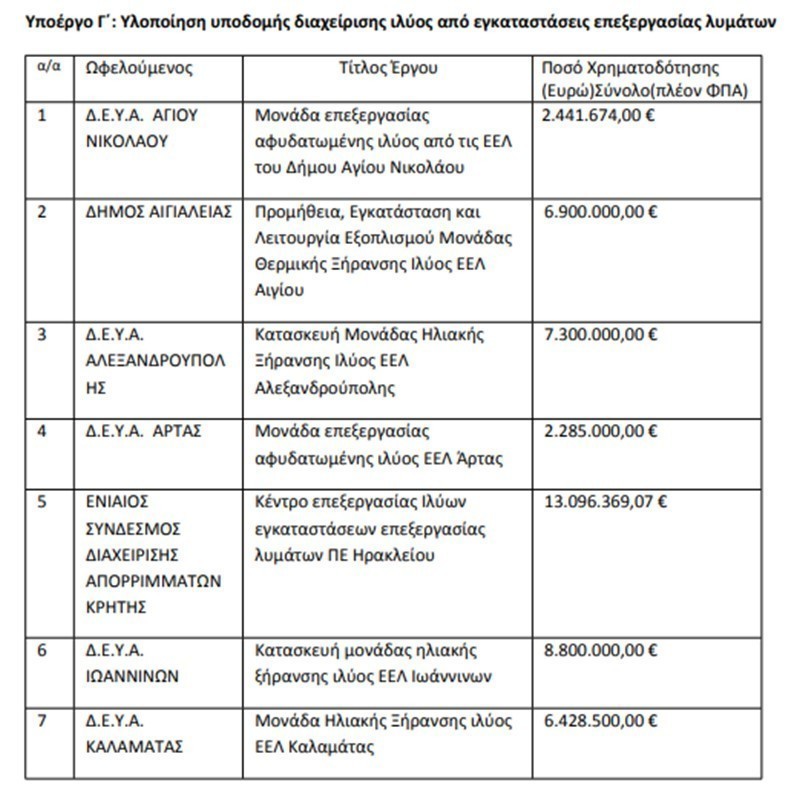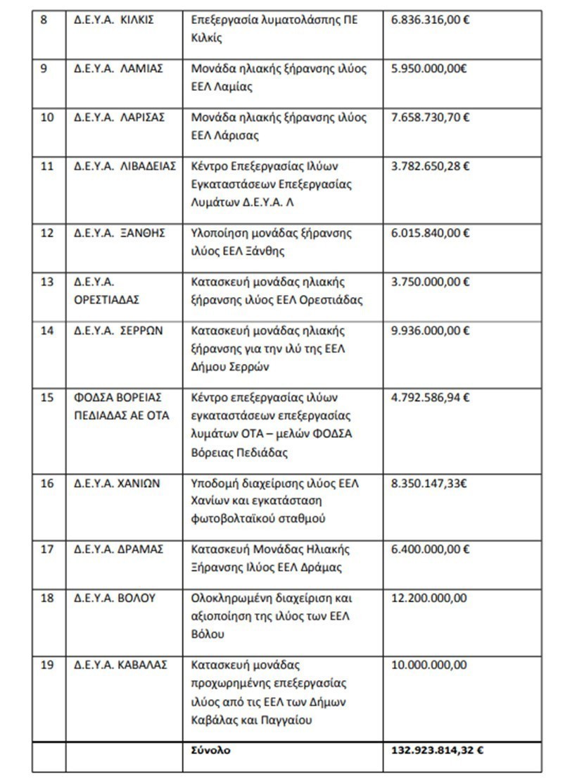 Αντίστοιχα για το υποέργο «Υλοποίηση υποδομής διαχείρισης ιλύος από εγκαταστάσεις επεξεργασίας λυμάτων» ο συνολικός προϋπολογισμός φτάνει στα 132.923.814 ευρώ με πιστώσεις που κυμαίνονται από 2,44 εκατ. ευρώ έως και 13,1 εκατ. ευρώ.