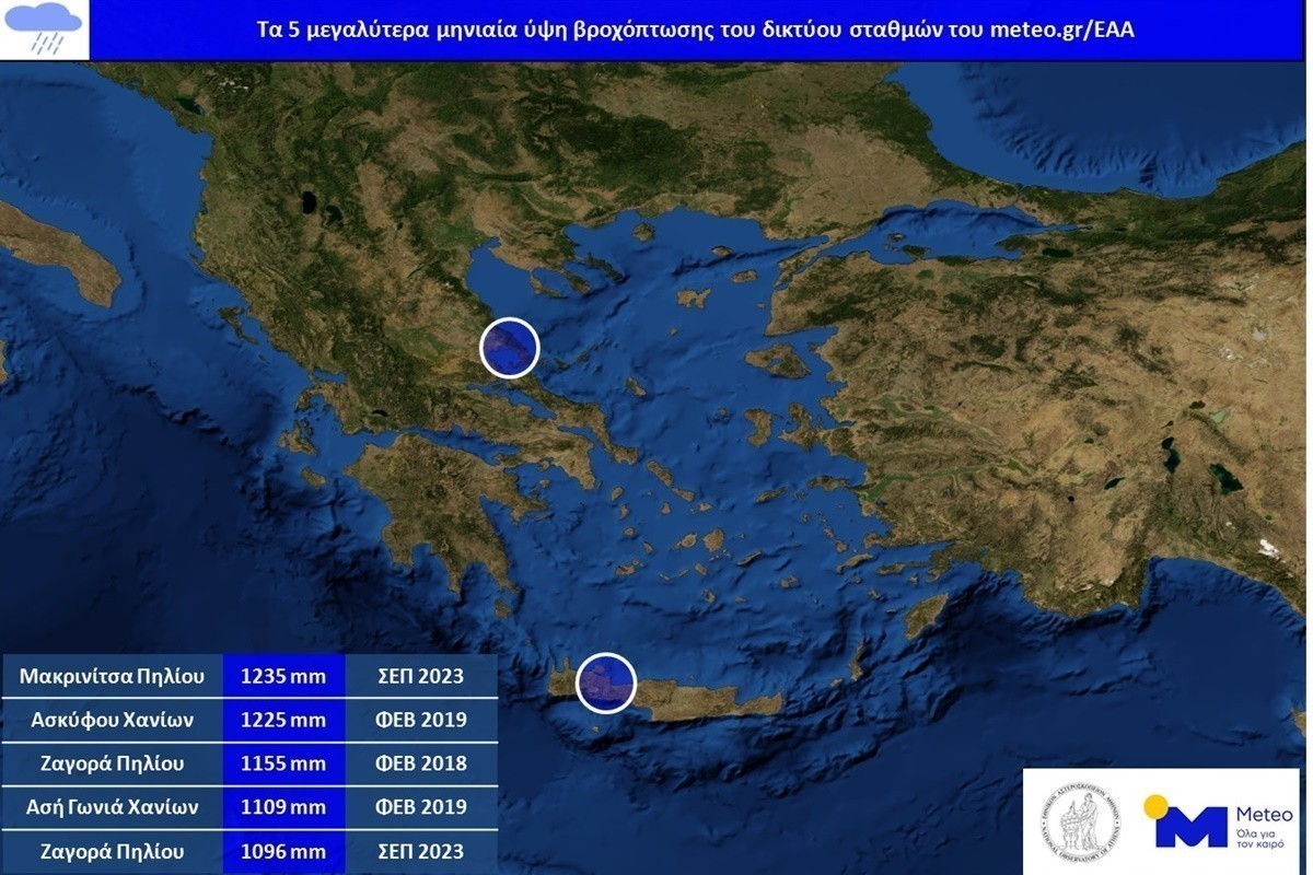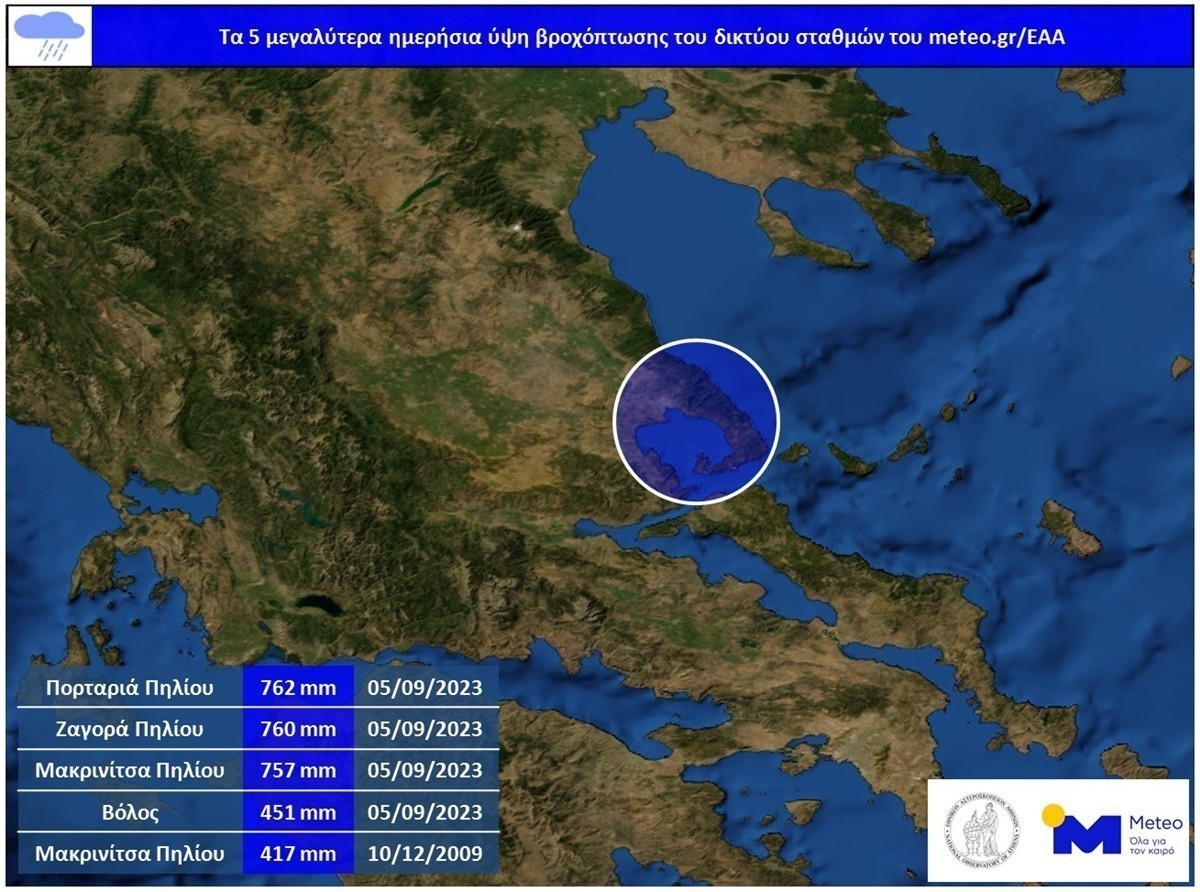 Ιδιαίτερη αναφορά γίνεται στο μετεωρολογικό σταθμό της Μακρινίτσας Πηλίου, ο οποίος μέχρι τις 20/09/2023 έχει καταγράψει αθροιστικό ύψος βροχόπτωσης 1235 χιλιοστά, τιμή που αποτελεί ήδη το μεγαλύτερο μηνιαίο ύψος βροχόπτωσης που έχει καταγραφεί ποτέ στην Ευρώπη.