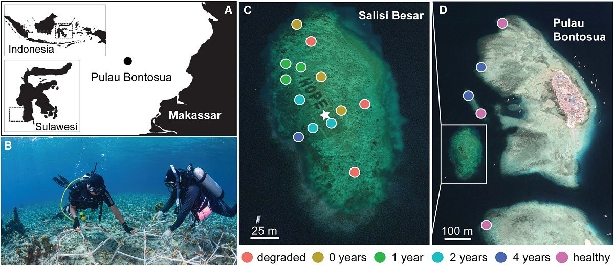 Η μελέτη διεξήχθη σε έναν κοραλλιογενή ύφαλο στο νότιο Σουλαουέζι της Ινδονησίας, ο οποίος πριν περίπου 30 χρόνια υπέστη καταστροφή έπειτα τη χρήση εκρηκτικών στο πλαίσιο της αλιευτικής δραστηριότητας στην περιοχή.