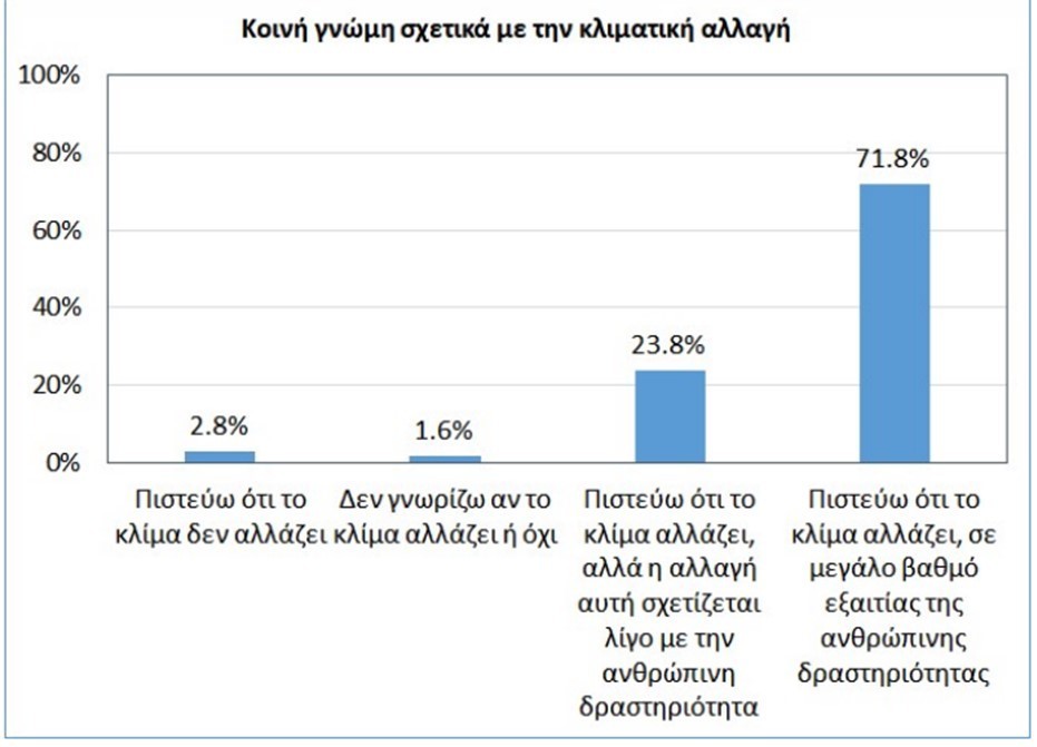- Οι πολίτες αναγνωρίζουν την ανθρώπινη ευθύνη απέναντι στο περιβάλλον, έχουν επίγνωση της κλιματικής αλλαγής, την οποία αντιλαμβάνονται κυρίως ως αποτέλεσμα της ανθρώπινης δραστηριότητας, αλλά είναι αισιόδοξοι ότι η τεχνολογική πρόοδος θα δώσει λύσεις στο πρόβλημα της κλιματικής αλλαγής.
