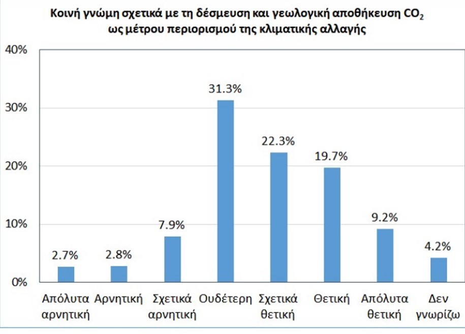 - Από την άλλη, οι πολίτες έχουν περιορισμένη ενημέρωση και γνώση για τη δέσμευση και γεωλογική αποθήκευση του CO2, ενώ έχουν -κυρίως- θετική ή ουδέτερη αντίληψη για τη χρήση της ως εργαλείου μετριασμού της κλιματικής αλλαγής.