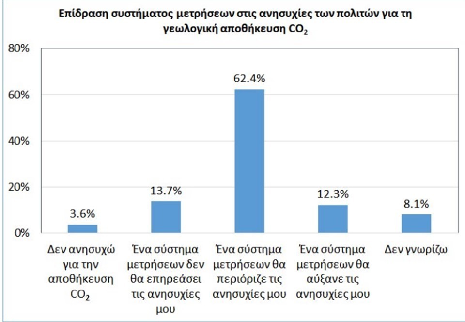 - Μικρό ποσοστό του ελληνικού πληθυσμού έχει αρνητική άποψη για τη γεωλογική αποθήκευση CO2. Ωστόσο, οι χώροι γεωλογικής αποθήκευσης CO2 γίνονται αντιληπτοί ως δυνητικός κίνδυνος για το περιβάλλον και οι πολίτες θα ανησυχούσαν για την παρουσία ενός πεδίου γεωλογικής αποθήκευσης CO2 στη γειτονιά τους ή ακόμα και υπεράκτια, κάτω από τον πυθμένα της θάλασσας.