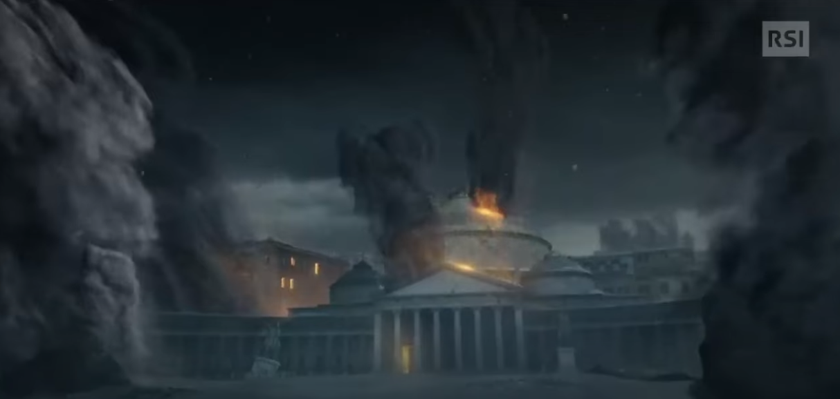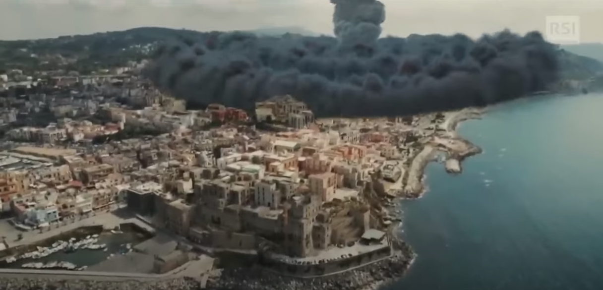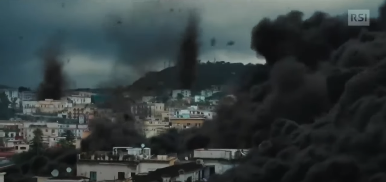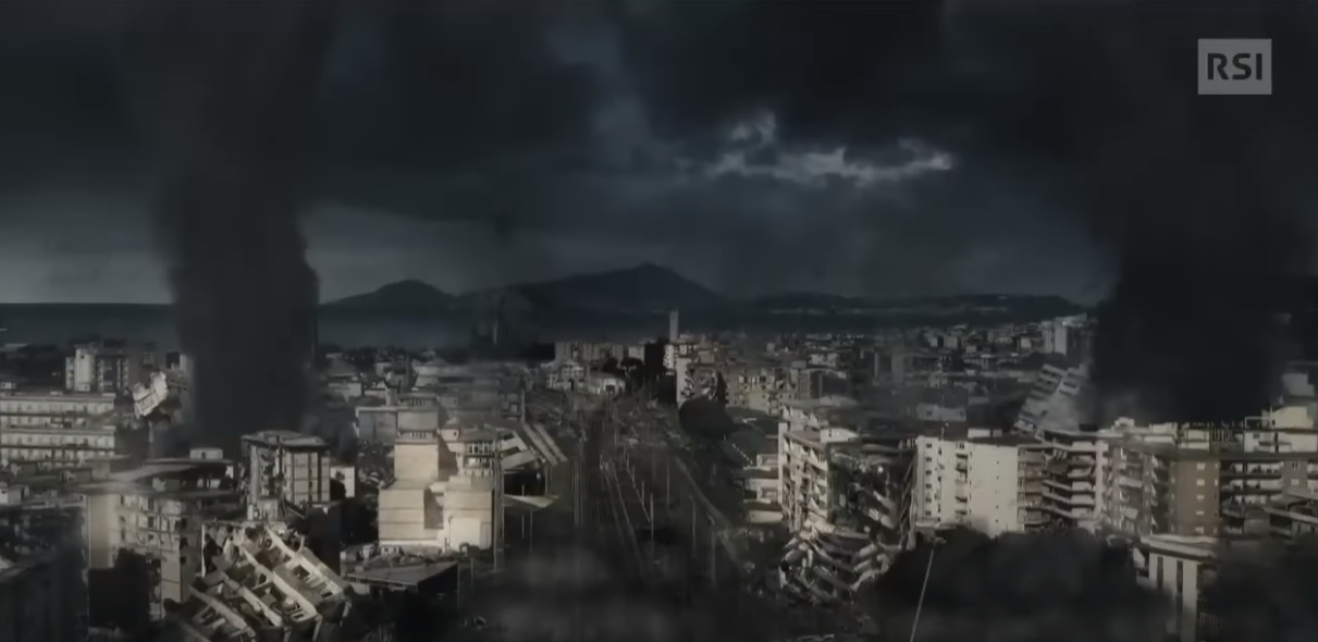 Στο πλαίσιο της τρομολαγνικής διάθεσης -ή μήπως πρόκειται για ρεαλιστική πιθανότητα;- η πιο όμορφη πλατεία της Νάπολης, Πλατεία του Πλεμπισίτο, καλύπτεται από πυκνά, μαύρα σύννεφα, η Βασιλική του Αγίου Φραγκίσκου ντι Πάολα καταστρέφεται με φλόγες να «γλείφουν» το κτίριο, η πόλη της Νάπολης «πνίγεται» στην τέφρα, οι εκρήξεις διαδέχονται η μία την άλλη.