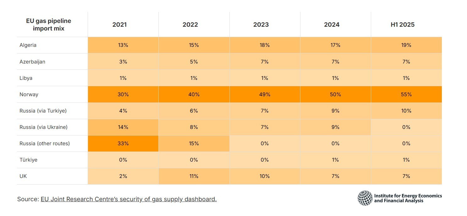 «Η ΕΕ σχεδιάζει να σταματήσει σταδιακά την εισαγωγή ρωσικού φυσικού αερίου και πετρελαίου έως το τέλος του 2027. Παρ’ όλα αυτά, οι ετήσιες εισαγωγές ρωσικού φυσικού αερίου μέσω αγωγών στην ΕΕ αυξάνονται σταδιακά τα τελευταία χρόνια. Κατά το πρώτο εξάμηνο του 2025, οι εισαγωγές φυσικού αερίου από την Αλγερία, τη Ρωσία μέσω Τουρκίας, την Τουρκία και το Ην.