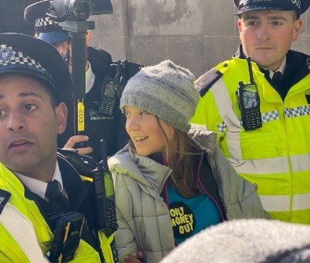 Η Τούνμπεργκ συνελήφθη έξω από το ξενοδοχείο InterContinental London Park Lane κατά τη διάρκεια της διαμαρτυρίας «Oily Money Out» που διοργανώθηκε από το Fossil Free London και την Greenpeace. Η διαδήλωση πραγματοποιήθηκε την πρώτη ημέρα του Φόρουμ Ενεργειακής Ευφυΐας.