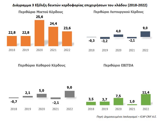 Οι συνολικές πωλήσεις των 18 επιχειρήσεων αυξήθηκαν κατά 17,6% το 2022 έναντι του 2021. Ομοίως, τα μικτά κέρδη αυξήθηκαν κατά 17% την ίδια περίοδο. Τα λειτουργικά και τα καθαρά κέρδη των εταιρειών του κλάδου υπερτριπλασιάστηκαν, κυρίως χάρις στην αύξηση των προμηθειών – λοιπών λειτουργικών εσόδων, την ίδια περίοδο. Θετική ήταν και η εξέλιξη των EBITDA που αυξήθηκαν κατά 86,1% και διαμορφώθηκαν σε €79 εκατ., το 2022. Όλες οι επιχειρήσεις (18) που συμπεριελήφθησαν στον ομαδοποιημένο ισολογισμό, ήταν κερδοφόρες το 2022 έναντι 16 το 2021.