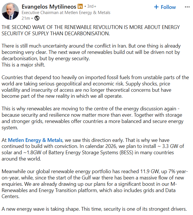 Ανάρτηση στο LinkedIn έκανε ο Ευάγγελος Μυτιλιναίος, Εκτελεστικός Πρόεδρος της Metlen Energy & Metals, τονίζοντας ότι το νέο κύμα ανάπτυξης των ανανεώσιμων πηγών ενέργειας καθοδηγείται κυρίως από την ανάγκη για ενεργειακή ασφάλεια, εν μέσω αυξημένων γεωπολιτικών κινδύνων, και λιγότερο από την απανθρακοποίηση.