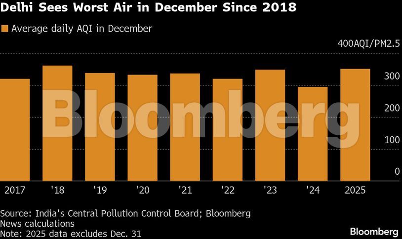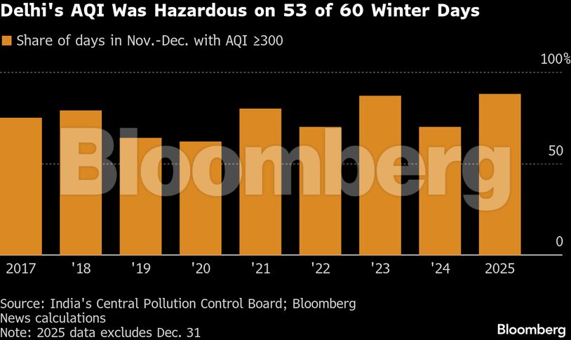 Τον Νοέμβριο και τον Δεκέμβριο —μήνες κατά τους οποίους η ρύπανση στο Νέο Δελχί κορυφώνεται παραδοσιακά— ο δείκτης ποιότητας αέρα (AQI) ξεπέρασε το επίπεδο των 300 στο 88% των ημερών, σύμφωνα με υπολογισμούς του Bloomberg βάσει επίσημων στοιχείων. Πρόκειται για το υψηλότερο ποσοστό τουλάχιστον από το 2017. Σύμφωνα με την Υπηρεσία Προστασίας Περιβάλλοντος των ΗΠΑ, επίπεδα κάτω από 50 θεωρούνται αποδεκτά, ενώ τιμές άνω των 300 χαρακτηρίζονται επικίνδυνες για την υγεία.