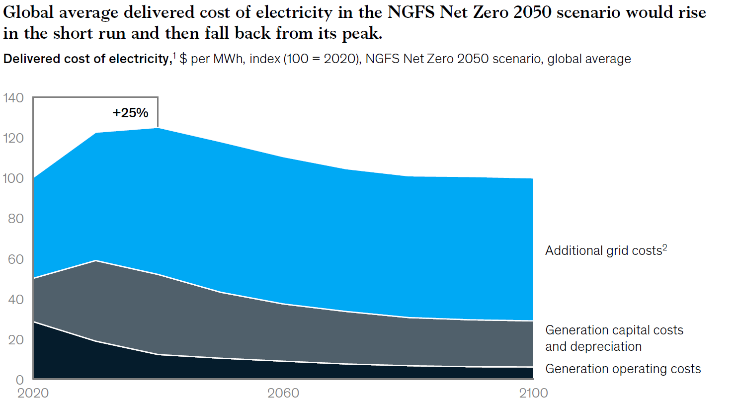 Καθώς ο τομέας της ενέργειας θα χτίζει τα νέα δίκτυα παραγωγής, μεταφοράς και διανομής με βάση τις ανανεώσιμες πηγές, το μοναδιαίο κόστος παραγωγής ηλεκτρικής ενέργειας, αναμένεται να αυξηθεί περίπου 25% από το 2020 έως το 2040 και να εξακολουθεί να είναι περίπου 20% υψηλότερα το 2050 κατά μέσο όρο παγκοσμίως (λαμβάνονται υπόψη το λειτουργικό κόστος, το κόστος κεφαλαίου και τις αποσβέσεις νέων και υφιστάμενων περιουσιακών στοιχείων).