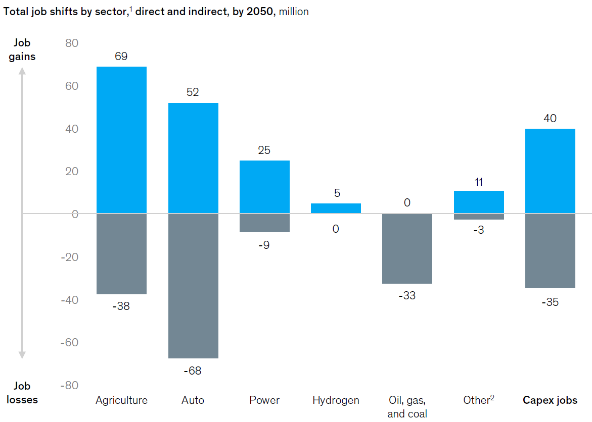 Ανακατανομή προβλέπεται σε γεωργία και παραγωγή τροφίμων: καθώς η ζήτηση για ζωικές πρωτεΐνες επηρεάζεται υπό τη μετάβαση στο net zero, περίπου 34 εκατομμύρια άμεσες θέσεις εργασίας, κυρίως στον τομέα της κτηνοτροφίας και των ζωοτροφών, μπορεί να χαθούν έως το 2050. Αυτές θα αντισταθμιστούν εν μέρει από 12 εκατομμύρια άμεσες νέες θέσεις εργασίας κυρίως στην πτηνοτροφία.