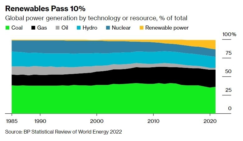 Κι αυτό, διότι έχουν αντικατασταθεί από τις ανανεώσιμες πηγές ενέργειας (ΑΕΠ), οι οποίες από μερίδιο 0,8% το 1985 σήμερα έχουν φθάσει σε μερίδιο 13%. Εντυπωσιακό είναι το γεγονός ότι οι ΑΠΕ ξεπέρασαν το όριο του 10% μόλις το 2019, καταφέρνοντας να προσθέσουν ένα επιπλέον 0,8% μέσα στο 2021. Όσο δηλαδή ήταν το συνολικό τους μερίδιο το… 1985.