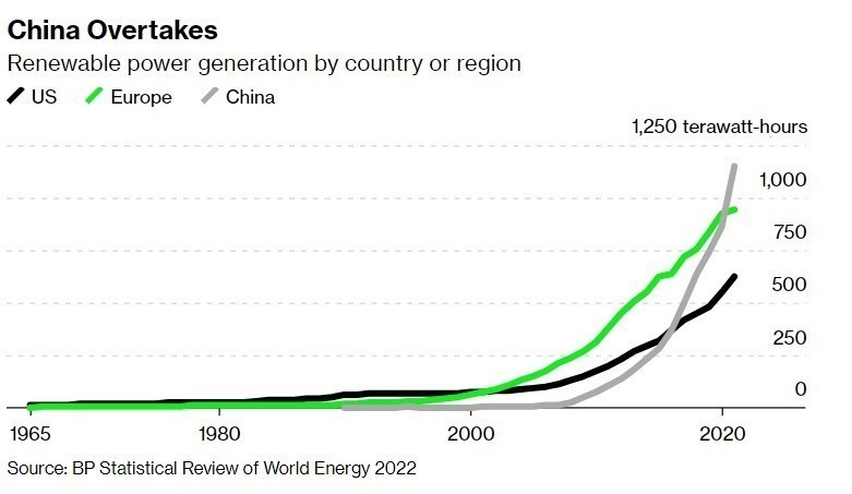 Το 2016, ωστόσο, η Κίνα άφησε πίσω τις ΗΠΑ και έφθασε πολύ κοντά στις ευρωπαϊκές επιδόσεις, οι οποίες επίσης είχαν αυξηθεί σημαντικά στο μεσοδιάστημα. Και μία πενταετία αργότερα, η ασιατική χώρα υπερέβη και την Ευρώπη, παράγοντας 290 τεραβατώρες. Από την πλευρά τους, Ιαπωνία και Ινδία δημιούργησαν συνδυαστικά «πράσινη» ηλεκτρική ενέργεια 302 τεραβατώρων.