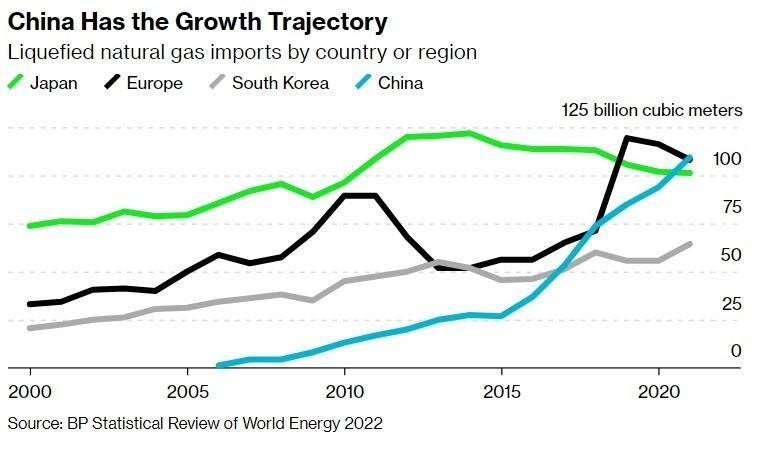 Η Κίνα μέχρι και το 2006 είχε καταγράψει… μηδενικές εισαγωγές LNG. Όλα αυτά άλλαξαν μέσα στα επόμενα χρόνια, με τη χώρα της Ασίας να εισάγει το 2021 την ποσότητα των 109,5 δισ. κυβικών μέτρων LNG. Δηλαδή 1,3 δισ. κυβικά μέτρα περισσότερα σε σχέση με τη δεύτερη Ευρώπη.