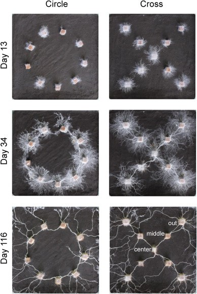 Για να δώσουν απάντηση στο ερώτημα πώς θα ανταποκρίνονταν οι μύκητες σε δύο διαφορετικές καταστάσεις τοποθέτησαν ξύλινα τεμάχια σε κυκλική διάταξη και σε σχήμα σταυρού.